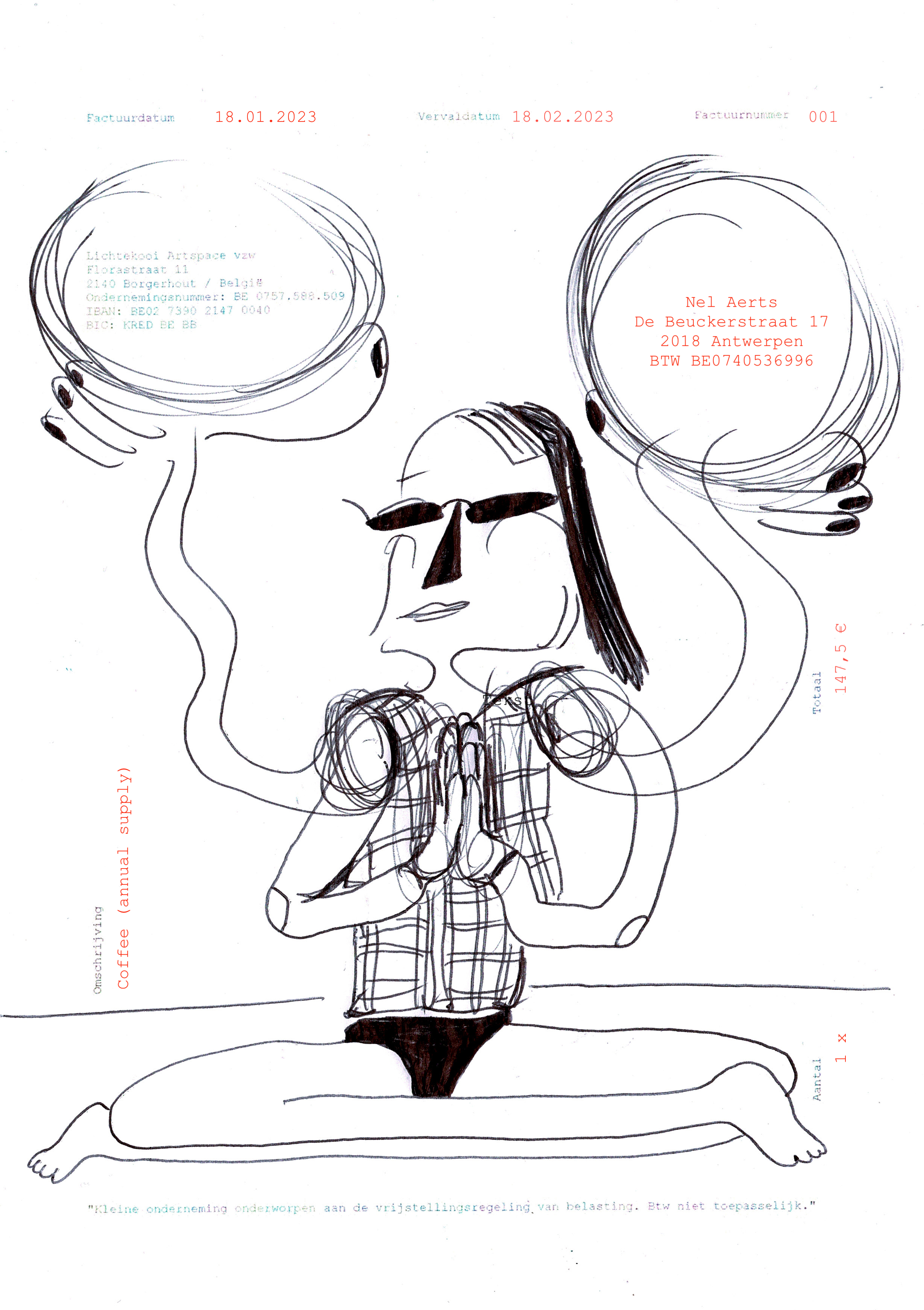 Using this webshop you can support Lichtekooi by contributing to a specific cost of our operation. As proof of purchase, Lichtekooi supporters receive an invoice designed by an artist. This year Nel Aerts designed an invoice.